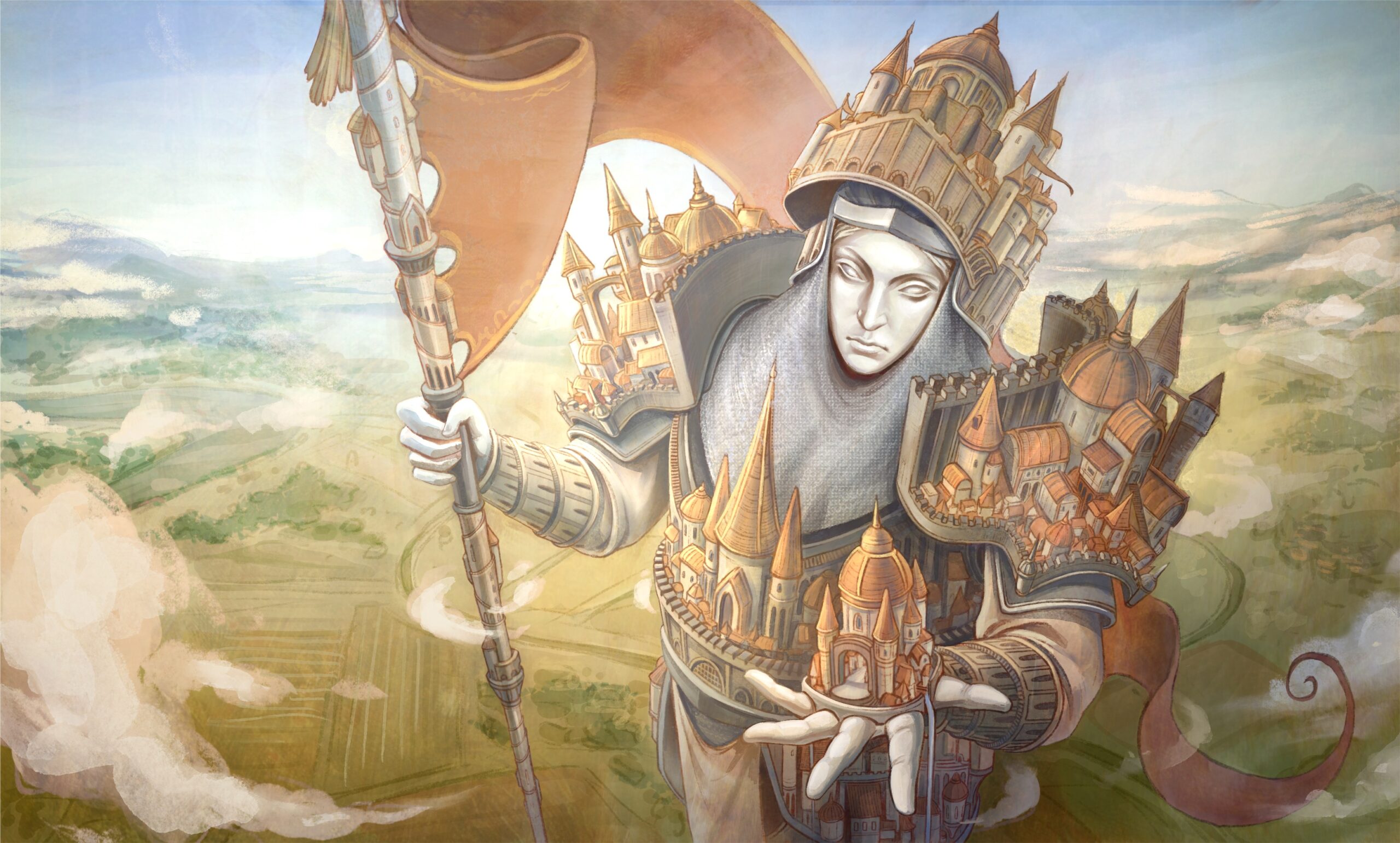 Alyse: The one I had the most fun creating would probably have to be Regdum, the Architect. I envisioned a god-like knight who was a protector or guardian of civilization. I already had the image in my head of an enormous statue-like figure, with their armor being a massive city itself, but turning this into reality was a challenge. I love a challenge though, so figuring out the structure, the armor-city, and the perspective on this massive figure overlooking a sprawling landscape was so much fun and made it my favorite!