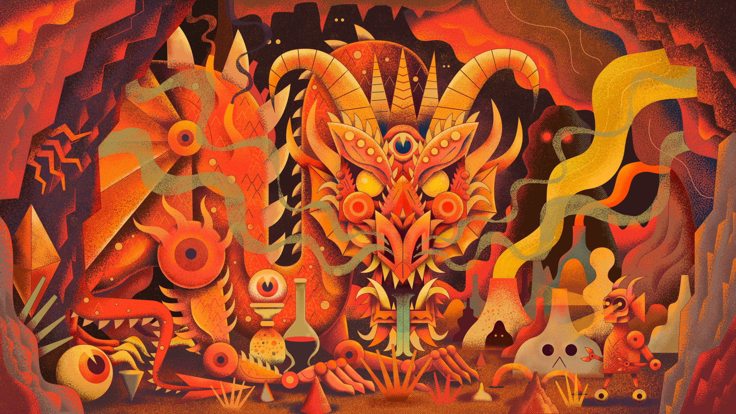 My favourite of the three is definitely the Dragon. I’ve always loved drawing these kinds of imposing, horned creatures, and I wanted to give this one a strong atmosphere using monochromatic reds and yellows to evoke fire and volcanic heat.