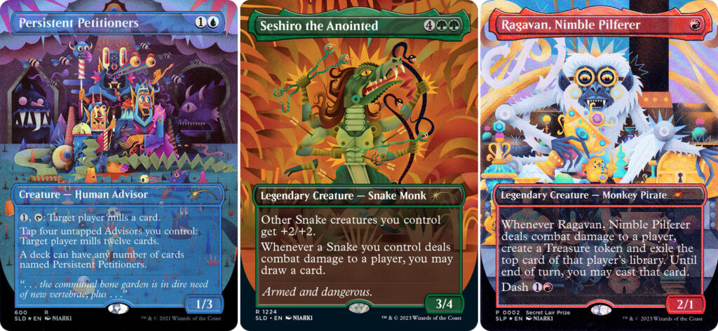 Niark1: My journey into the world of Magic: The Gathering (MtG) began when I was approached to contribute to the Secret Lair packs. I first illustrated a version of Persistent Petitioners and then later, Seshiro. However, the most significant project was creating the tournament prize card version of Ragavan, Nimble Pilferer.