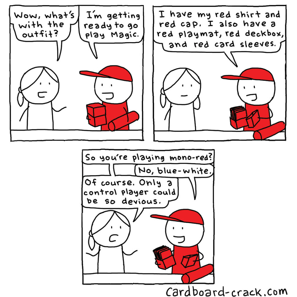 Doing a black and white comic has the advantage that when I actually add color it’s that much more impactful. The problem is how to print comics like this in my books, because my books have black and white interiors. Maybe someday I’ll have to do a special book that collects are my color comics together. While I’ve never seen someone go this far with trying to fool their opponent, I’ve definitely seen people purposely use sleeves that give the wrong impression about their deck.