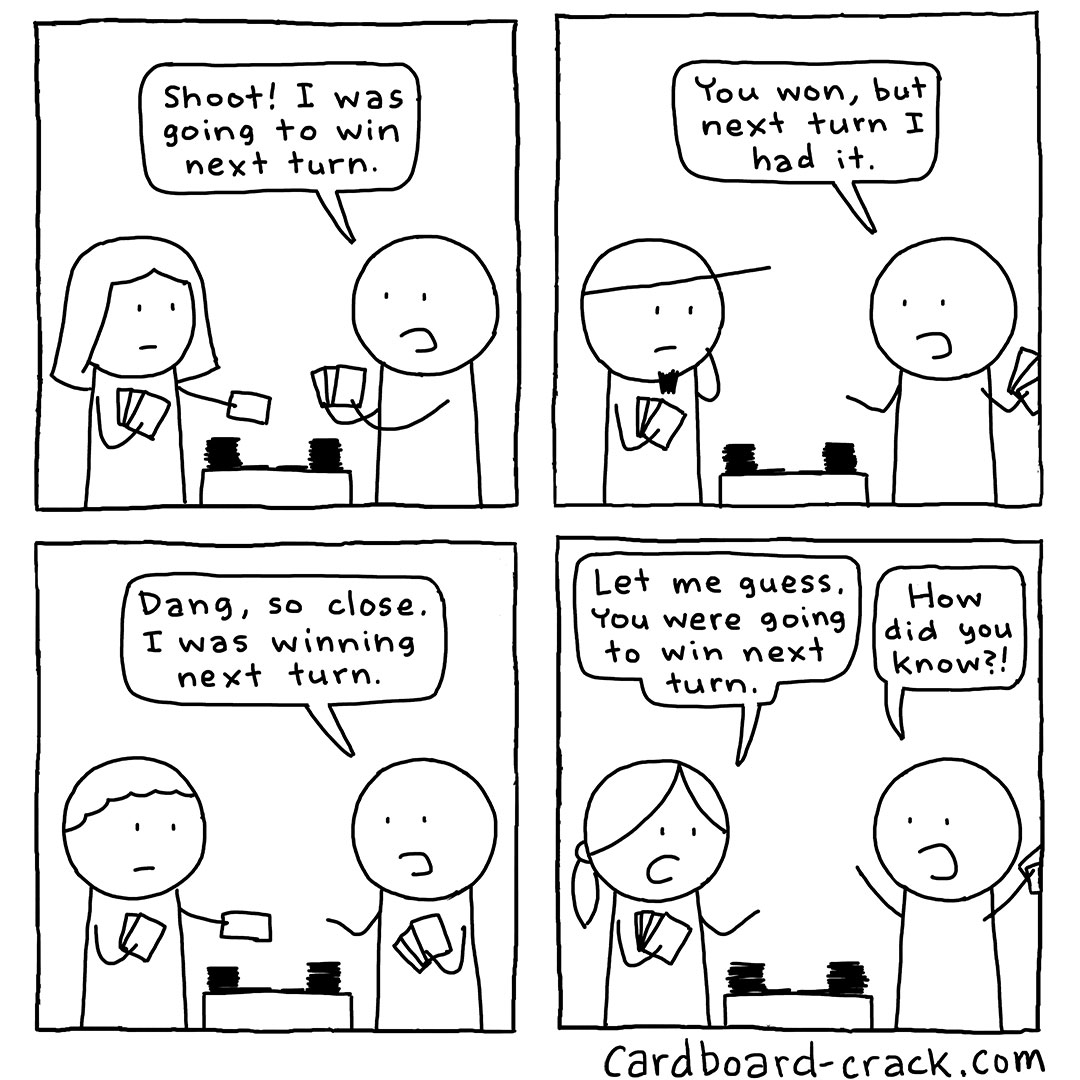 Sometimes writing these comics can be as simple as just observing what players are doing and translating it into comic form. This particular comic is definitely an example of something I’ve known many players to do. The important thing for me is to always write down these ideas as soon as I see them, whether it’s on a scrap of paper or type a note on my phone. I never trust myself to remember these ideas because I’ve been burned too many times by not writing something down and then later forgetting it.