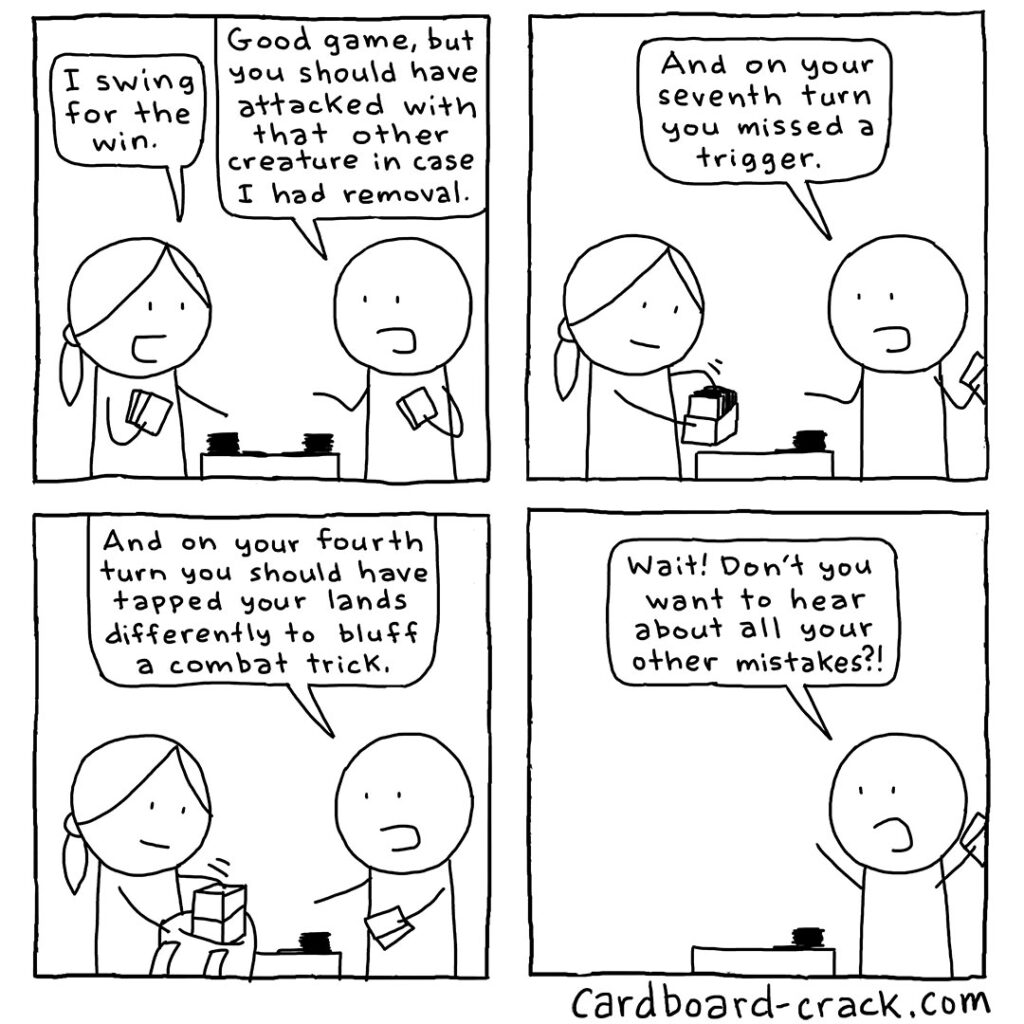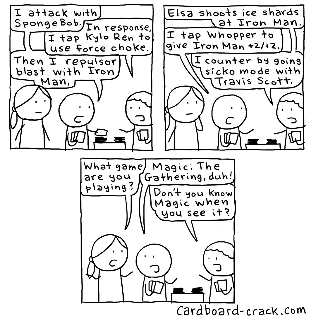 If I had to pick my most famous (or maybe infamous) comic, it would probably be this one. Drawn September 2020, this was actually soon after I had restarted Cardboard Crack after a few year hiatus (maybe a story for another time). Anyway, I made this comic near the beginning of the “Universes Beyond” initiative because I was somewhat apprehensive about whether this new direction would eventually turn Magic into Fortnite. At the time, all of the pop culture references I made in the comic were not yet part of Universes Beyond, so it’s funny to see that SpongeBob and Iron Man both came true. Because of this comic, I am often asked at conventions how it feels to have predicted the future. The answer is, I would have rather been wrong, lol!